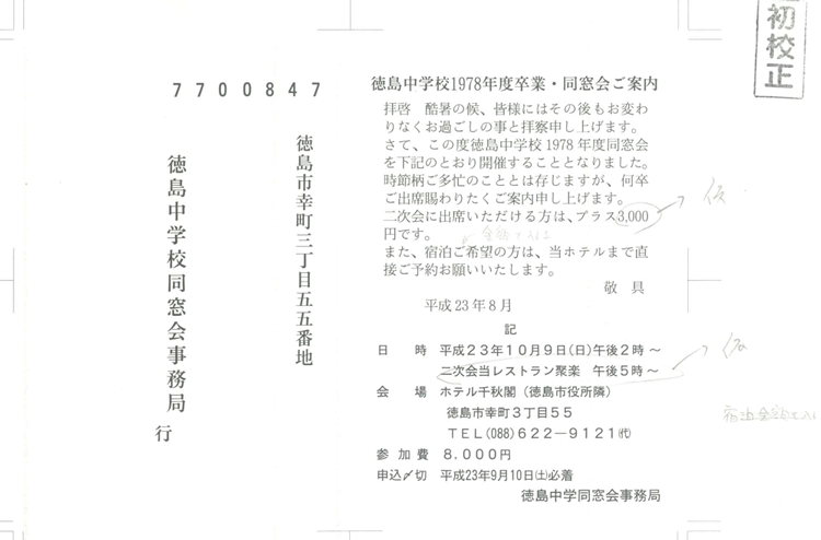 往復ハガキにて御案内差し上げますので返信をお願いいたします。